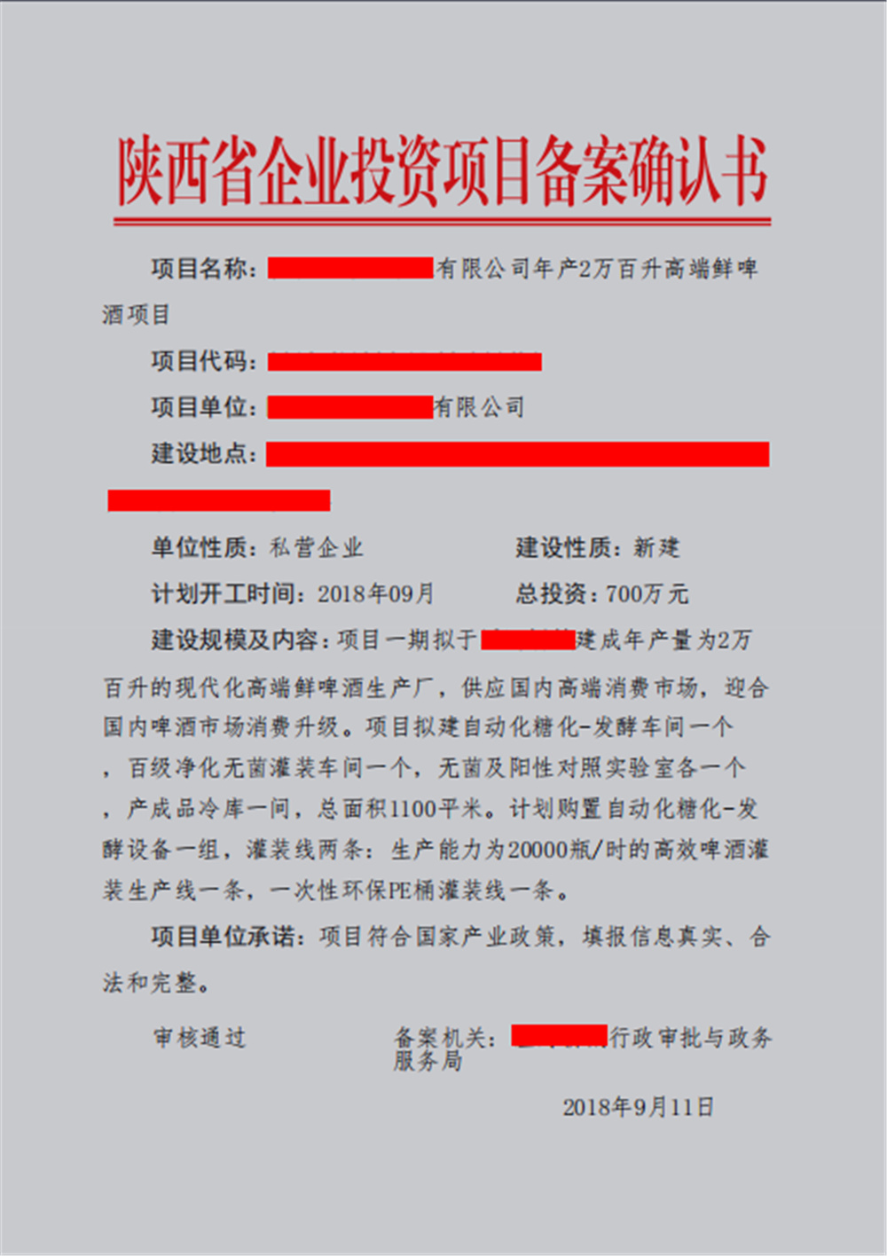 啤酒屬于“企業投資項目備案” “輕工”。備案下放到縣區一級。
